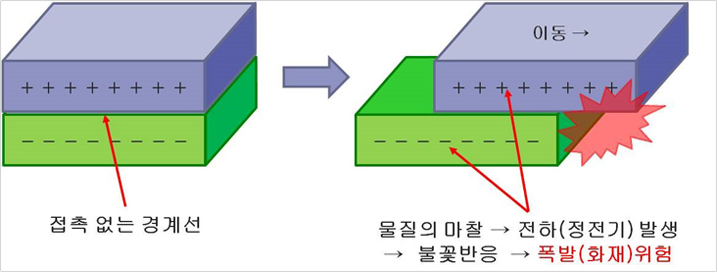 - 입자형 원료 등이 Bag 내부로 투입/배출 작업시 입자와 Bag 내부면의 마찰로 인하여 강한 정전기가 발생하여 불꽃반응으로 폭발 및 화재 가능성이 있음.