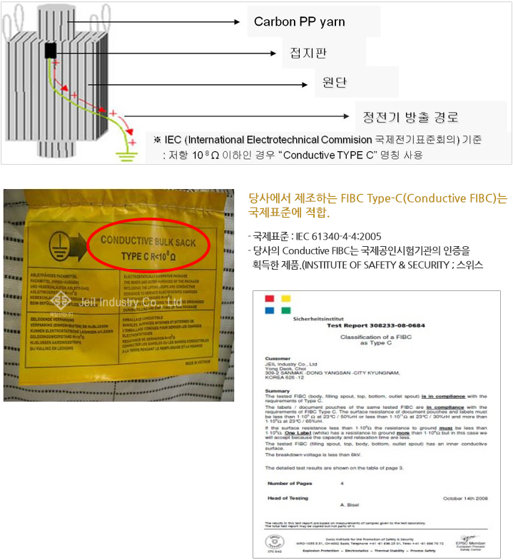 * 당사에서 생산하는 FIBC는 "Type-B"의 인증획득(LABORDATA: 독일) - Type-C FIBC(Conductive FIBC)?